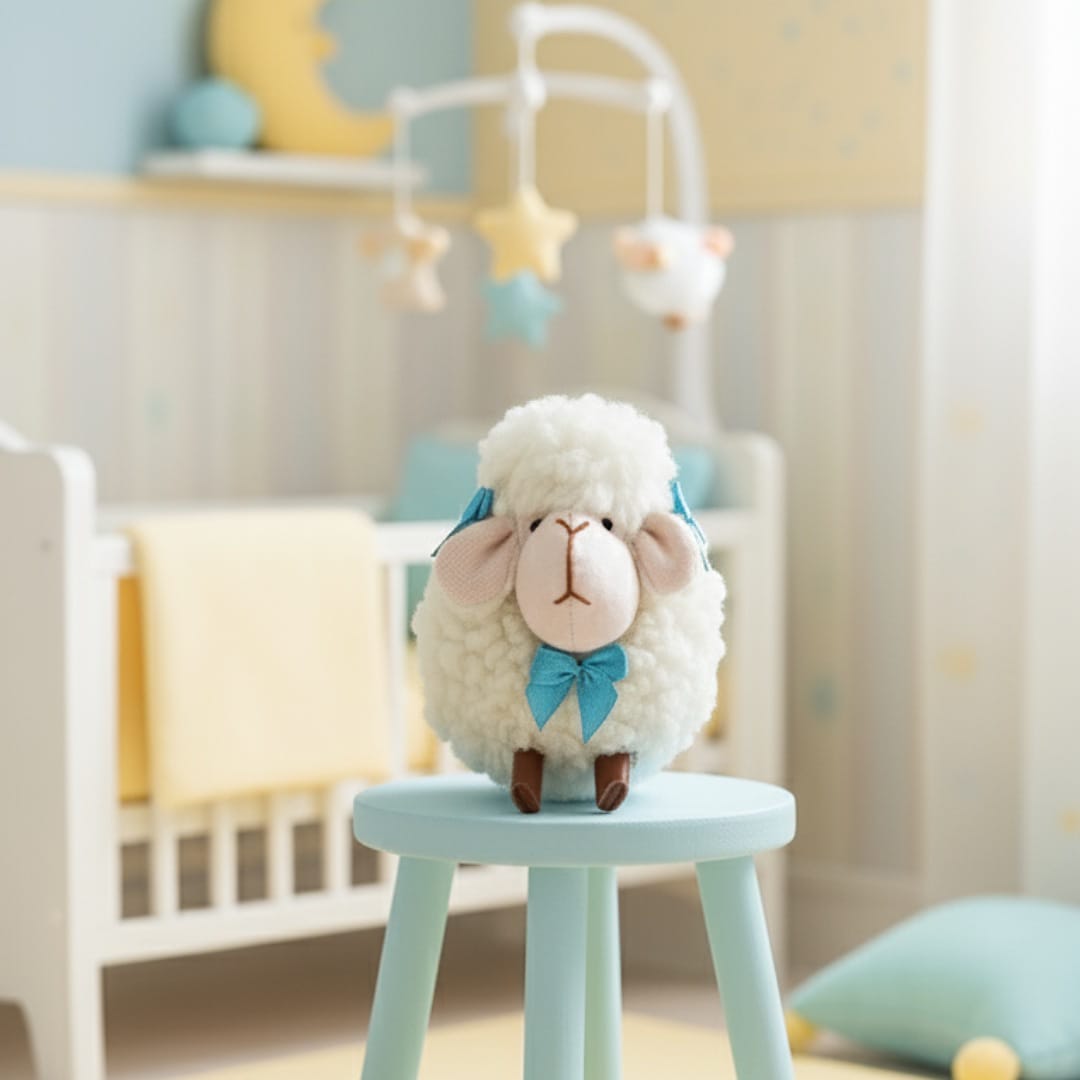 Ovelhinha de pelúcia feita à mão que pode ser usada como lembracinha de chá de bebê, como chaveiro ou até mesmo como um brinquedo lúdico.
