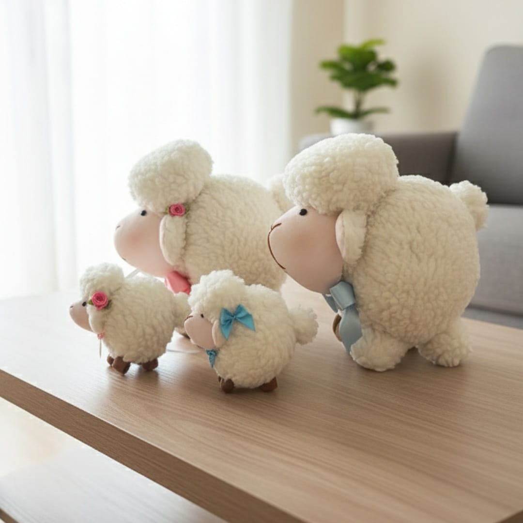 As ovelhas são feitas em tecido de carapinha para dar um toque suave para a peça. Inclui duas peças pequenas e delicadas medindo aproximadamente 10 centímetros de altura por 11 centímetros de comprimento e 8 centímetros de largura e também duas peças maiores medindo aproximadamente 15 centímetros de altura, 10 centímetros de largura e 20 centímetros de cumprimento.